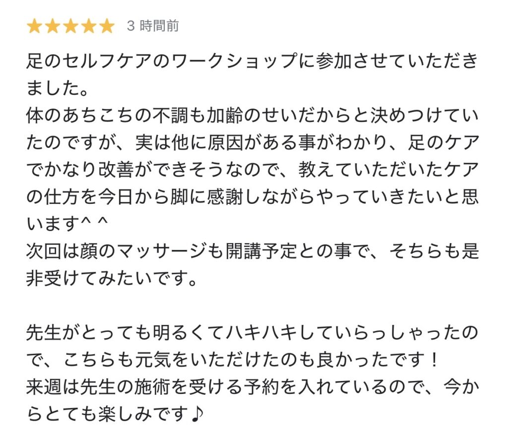 教えていただいたケアの仕方を今日から足に感謝しながらやっていきたいと思います」
